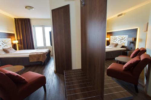 Alla Scandic Östersund Citys rum har en sällskapsdel och ett skrivbord. Vissa har utsikt över Storsjön och de omgivande bergen.