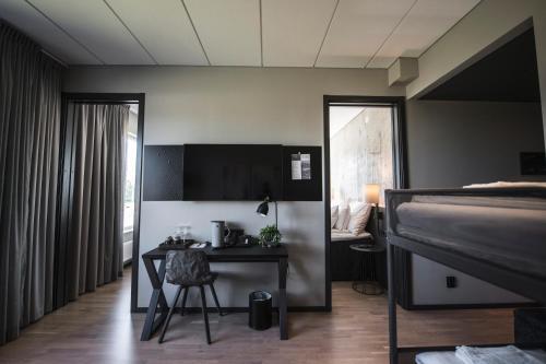 Detta familjerum har en platt-tv, en sittgrupp och ett skrivbord.